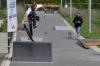 Zurück mit dem Blick auf die Aktionsflächen zeigten ab 14 Uhr Anfänger, Amateure und Profis unter anderem beim „Street Contest“ ihr Können. Jeder Teilnehmer durfte in zwei Läufen von jeweils einer Minute zeigen, was er so alles auf die Straße, die Rampe oder die anderen Hindernisse brachte.