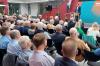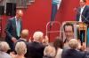 Selbstverständlich benötige der Vorsitzende der größten Oppositionsfraktion im Bundestag keine Genehmigung durch die Bundesregierung, in die Ukraine zu reisen, betonte der Redner. Aber es gebe im Bundestag einen breiten Konsens mit SPD, FDP und den Grünen, „dass wir der Ukraine helfen“. Und das nicht nur mit Waffen, hielt Merz den Demonstranten entgegen, die sich unters Publikum gemischt hatten und ein Transparent entrollten, auf dem sie den Volksvertretern vorhielten, ihre Amtseide zum Wohl des deutschen Volks nicht angemessen zu erfüllen. Ihre Zwischenrufe, die das Publikum mit lautstarkem Applaus für den Redner kommentierte, konterte Merz mit der Einladung, anschließend mit ihm zu diskutieren, was die kleine Gruppe aber nicht annahm.