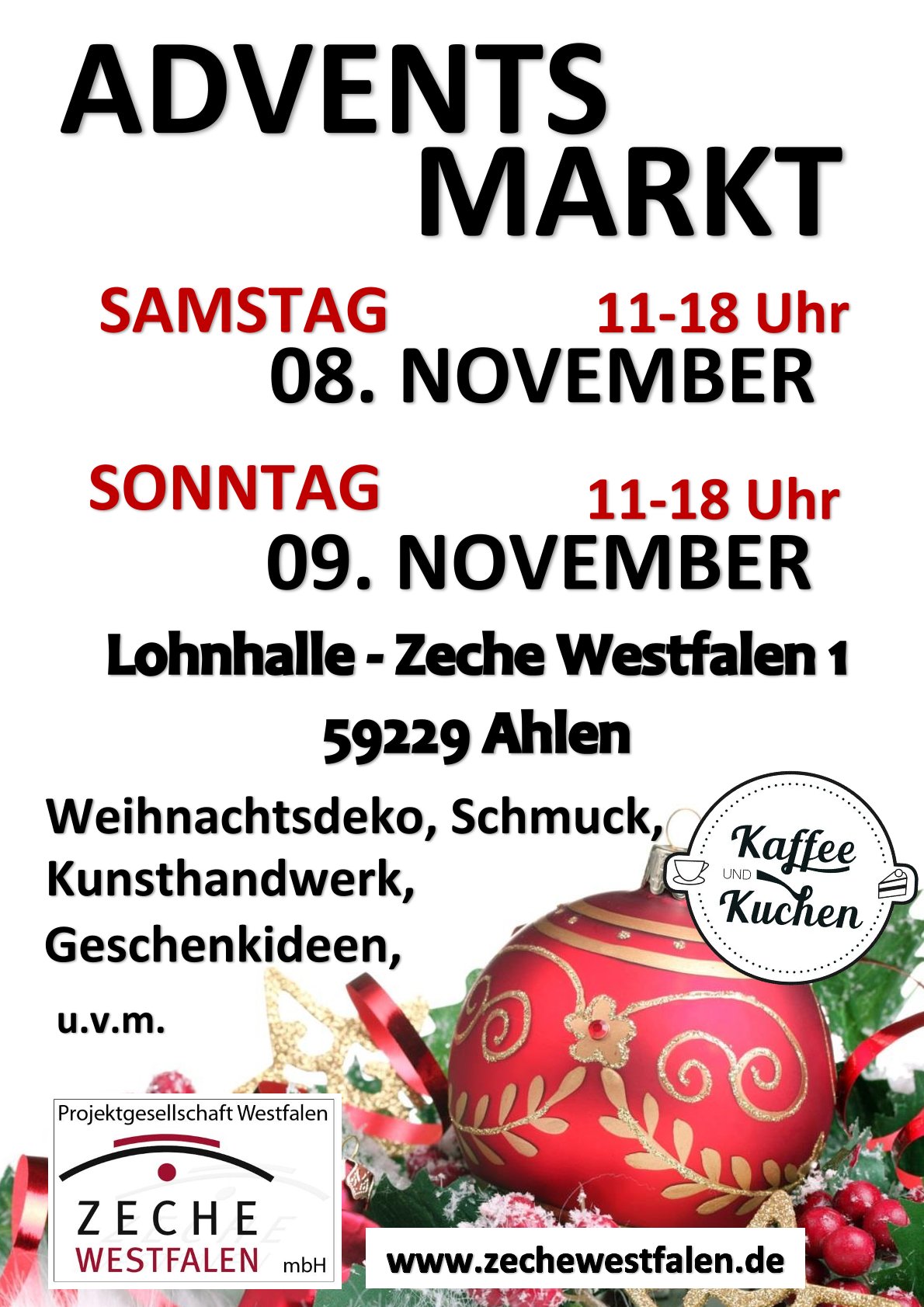 Wie im letzten Jahr soll auch in diesem Jahr der Adventsmarkt in der Lohnhalle der Zeche Westfalen zum 17. Mal stattfinden. Der Adventsmarkt ist der größte Kunsthandwerkermarkt zur Weihnachtszeit im Kreis Warendorf und wie in jedem Jahr werden neue Anbieter gesucht, damit das Angebot sich wandelt und "den dekorativen Zeitgeist einfängt," wie Hermann Huerkamp, Geschäftsführer der Projektgesellschaft Westfalen feststellt. Der Adventsmarkt ist "alle Jahre wieder" ein etablierter Magnet für kunsthandwerklich Interessierte, hat mittlerweile Tradition und einen festen Kundenstamm in Ahlen und in der Region. Alles was mit Kunsthandwerk zu tun hat und selbst gefertigt ist, wird gezeigt, wie beispielsweise Krippen und Adventskränze, auch Schmuck jeglicher Coleur, selbstentworfene und angefertigte Kinderkleidung, selbst designte Bettwäsche, Modeaccessoires, wie Schals, Taschen und Mützen, oder Liköre, Zechnhonig und Marmeladen bis hin zu selbst kreierten Gemälden.
